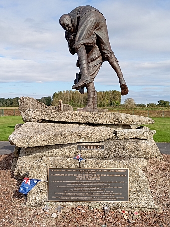 Their counterpoint, and the central feature of the Park, is an extraordinary sculpture. "Cobbers". This was completed in 1998 by Peter Corlett, and shows Sergeant Simon Fraser rescuing a wounded compatriot from no-mans land after the battle. The title comes from a letter that Fraser, a farmer from Byaduk in Victoria, wrote a few days after the battle and that was also quoted in Australia's 0fficial War History, edited by Charles Bean:
